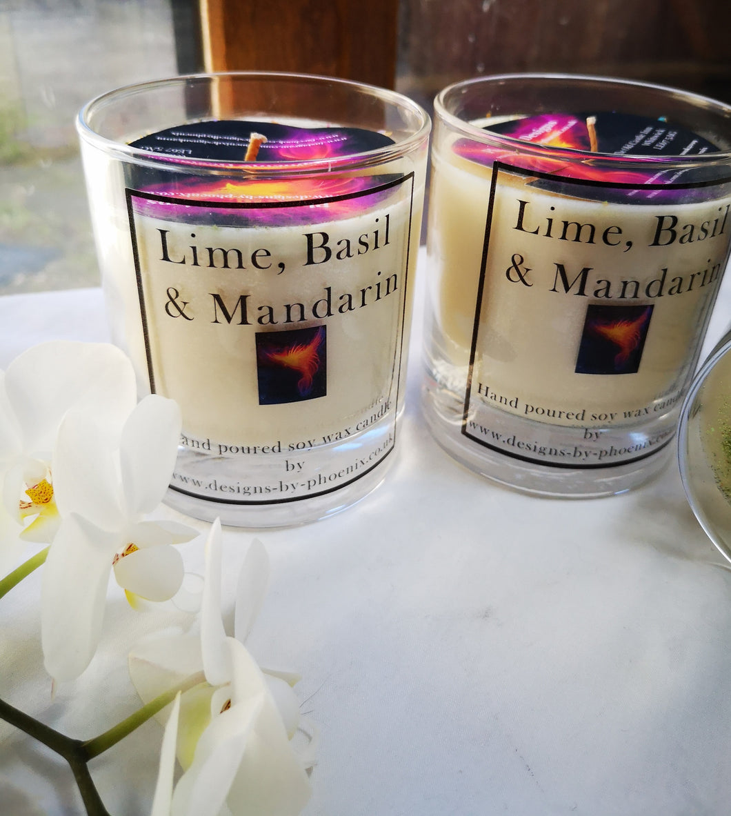 Gloriously scented soy wax candle in lime basil & mandarin, this is a wonderful scent and one of my favourites, based or inspired on the popular range by Jo Malone. and all at a fraction of the cost. with our new labelling this now looks just as good as commercially produced luxury candles. and smells even better.